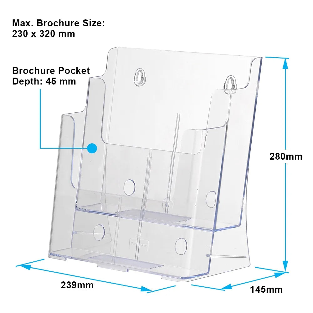 Clear magazine holders offer an efficient way to display magazines, catalogues, brochures, and more to visitors. This display features two tiers, allowing you to present multiple materials while saving space. Each pocket accommodates A4 (210 x 297mm) literature in portrait orientation, with 45mm deep pockets providing ample room. Convenient cut-outs on each level make it easy for customers to remove materials.