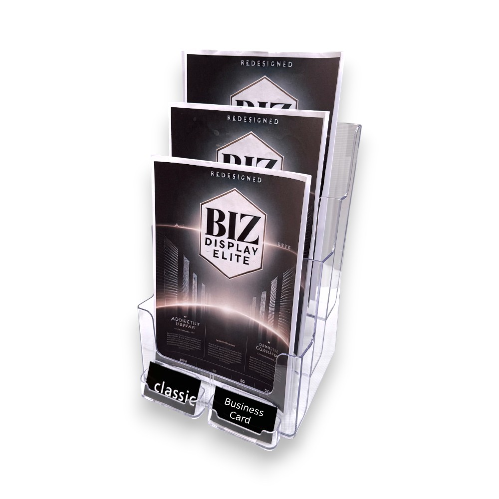 A4 Brochure Holder – 3-Tier with Business Card Holders, Clear Acrylic Counter Display