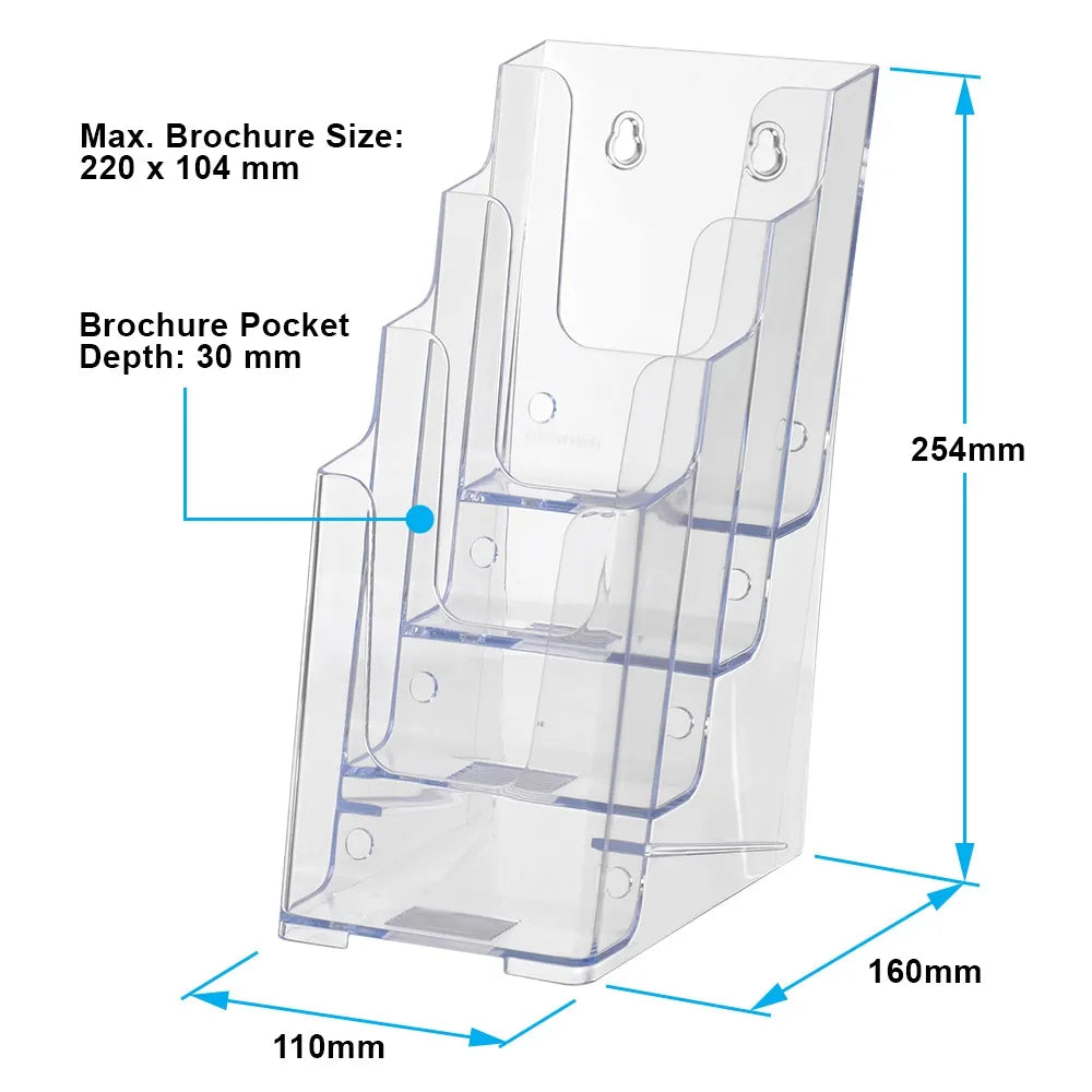 Multi-pocket literature holders feature four tiers, allowing you to display a large number of brochures in a compact space. The 30mm deep pockets provide ample room to keep the display well-stocked with DL (99 x 210mm) brochures in portrait orientation, making it an efficient solution for presenting informational materials.