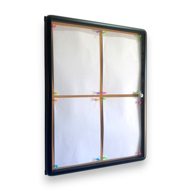 Lockable Indoor Cork Notice Board – Black Aluminum Frame, Fits 6x A4, Wall-Mounted