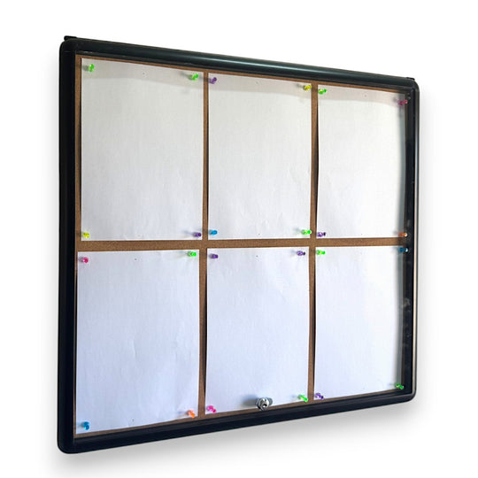 Lockable Indoor Cork Notice Board – Black Aluminum Frame, Fits 6x A4, Wall-Mounted