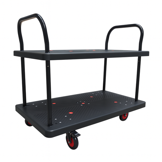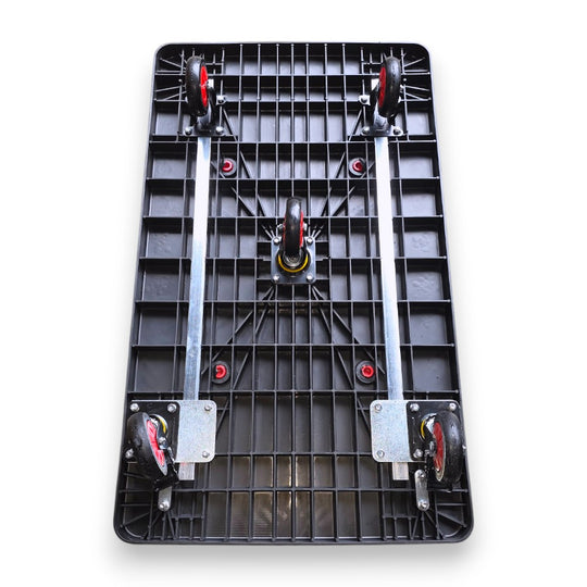 Built to handle heavy industrial loads with ease, this heavy duty platform trolley features a reinforced polypropylene deck, zinc-coated steel handle, and ultra-silent castors with integrated brakes. Ideal for warehouses, logistics, and commercial operations.