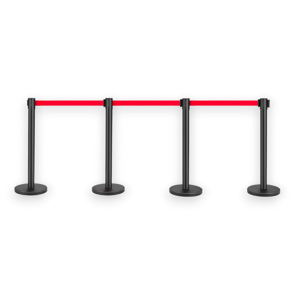 - Complete Set: Includes 4 black retractable barrier posts, each with a 2m red nylon belt.