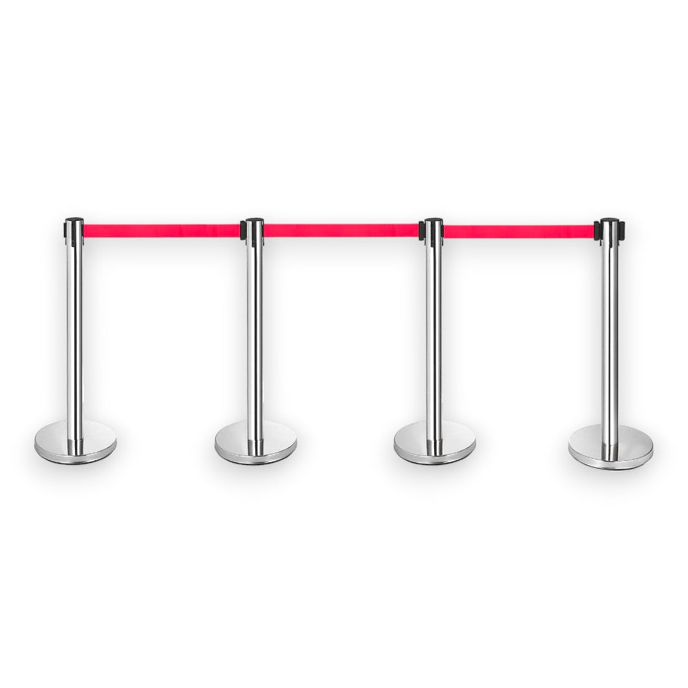 - Complete Set: Includes 4 silver retractable barrier posts, each with a 2m red nylon belt.