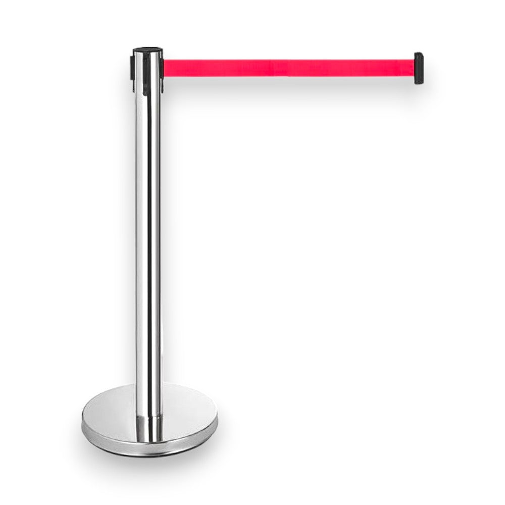 Silver Retractable Barrier Post – 2m Red Belt, 4-Way Connector, Weighted Base