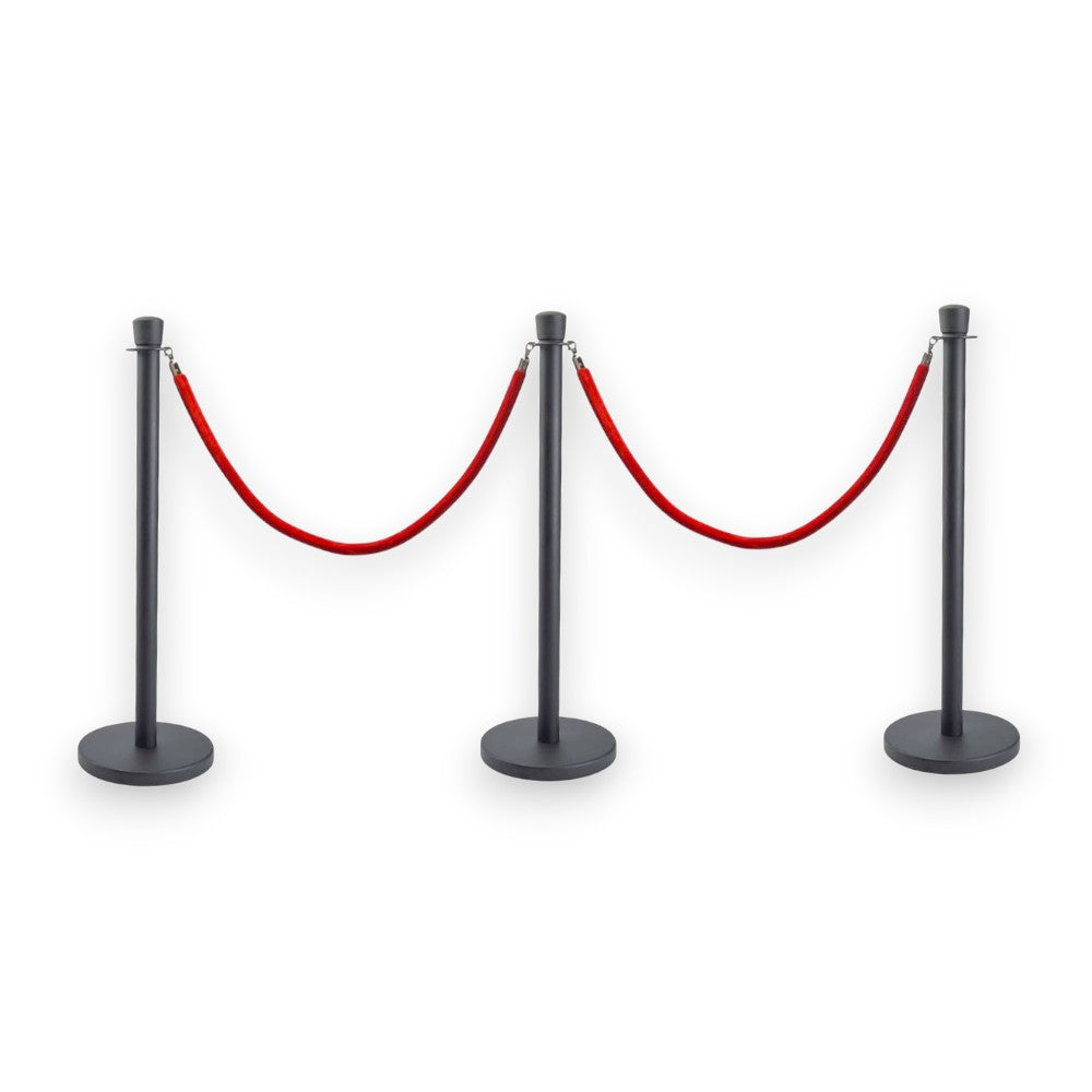 Black Crowd Control Bollards Set of 3 Posts + 2 Red Ropes