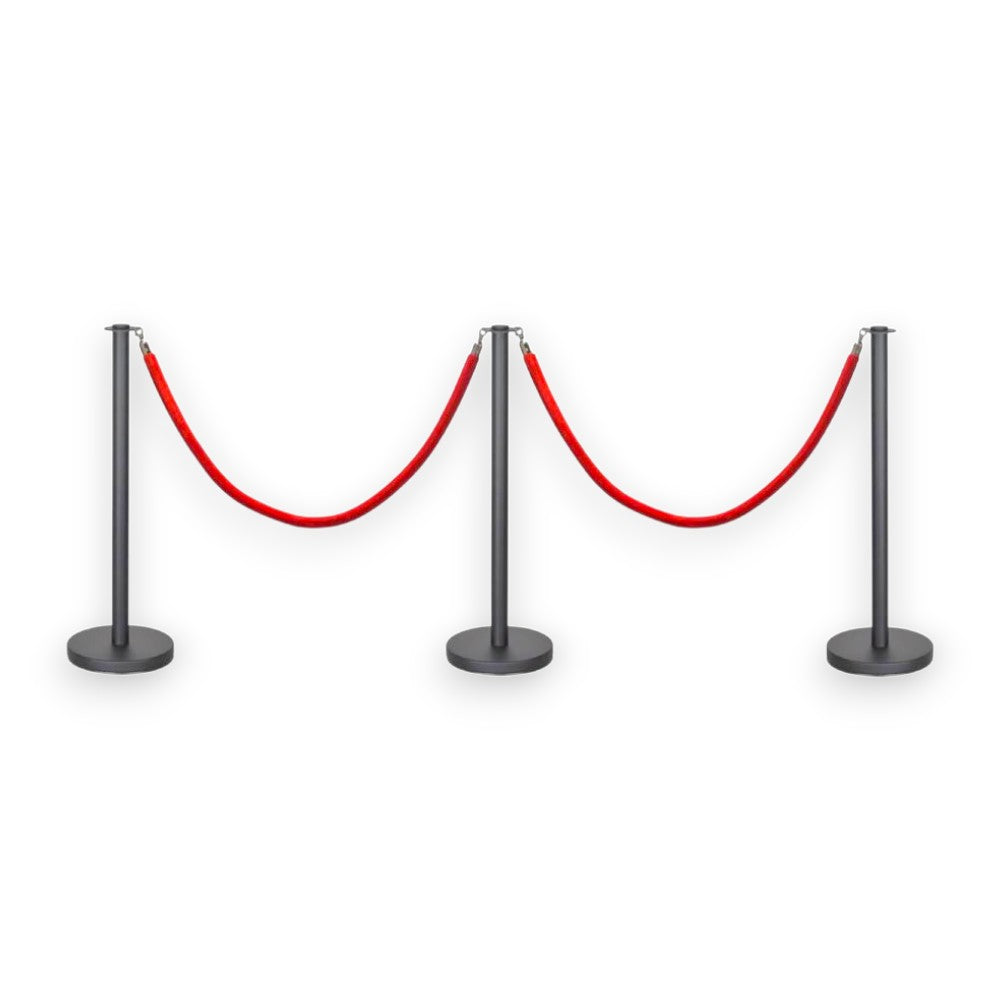 - Complete Set: 3 matt black bollard posts and 2 red velvet ropes.