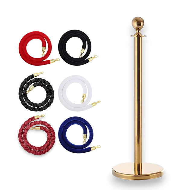 - Complete Set: 3 gold bollard posts and 2 red velvet ropes.