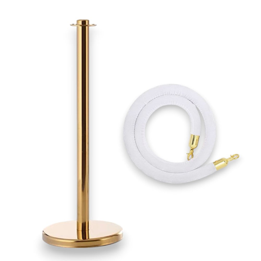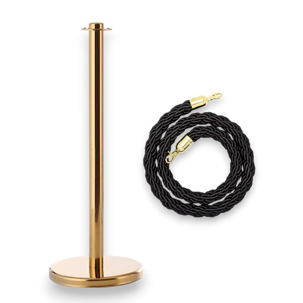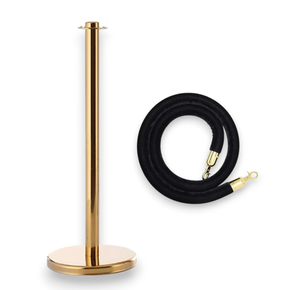 This elegant stanchion pole with a gold finish and Cap Top is perfect for managing crowds in bars, restaurants, cinemas, exhibition halls, and car dealerships. Designed for stability, it features a weighted base made of rubber encased in a steel shell, with a rubber protector to prevent floor scuffing. Standing 1000mm tall, it is easy to assemble without tools and offers 4-way connectivity, making it versatile for any setup.