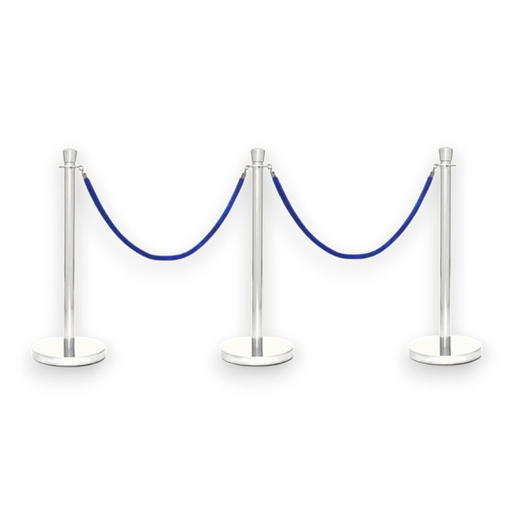 - Complete Set: 3 Silver bollard posts and 2 Blue velvet ropes.