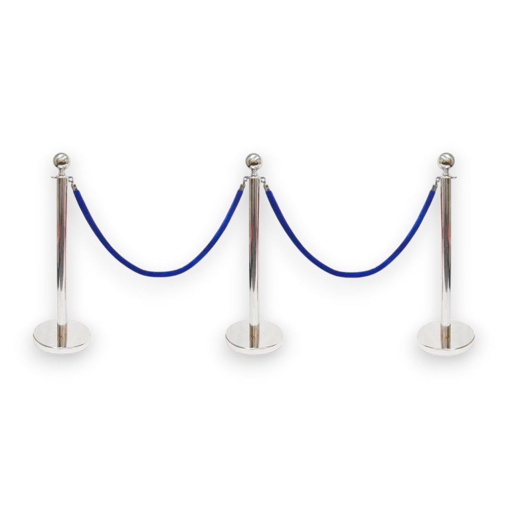 - Complete Set: 3 Silver bollard posts and 2 Blue velvet ropes.