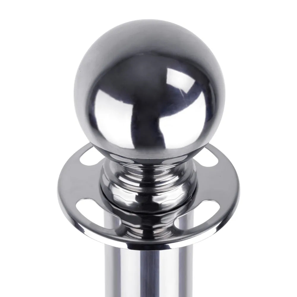 Enhance your space with this Silver Crowd Control Bollards Set, featuring a sophisticated crown-style top design. The set includes 3 polished stainless steel bollard posts (1 metre tall, 32cm base) and 2 Blue velvet ropes (1.5 metres each), covering approximately 2.7 metres.