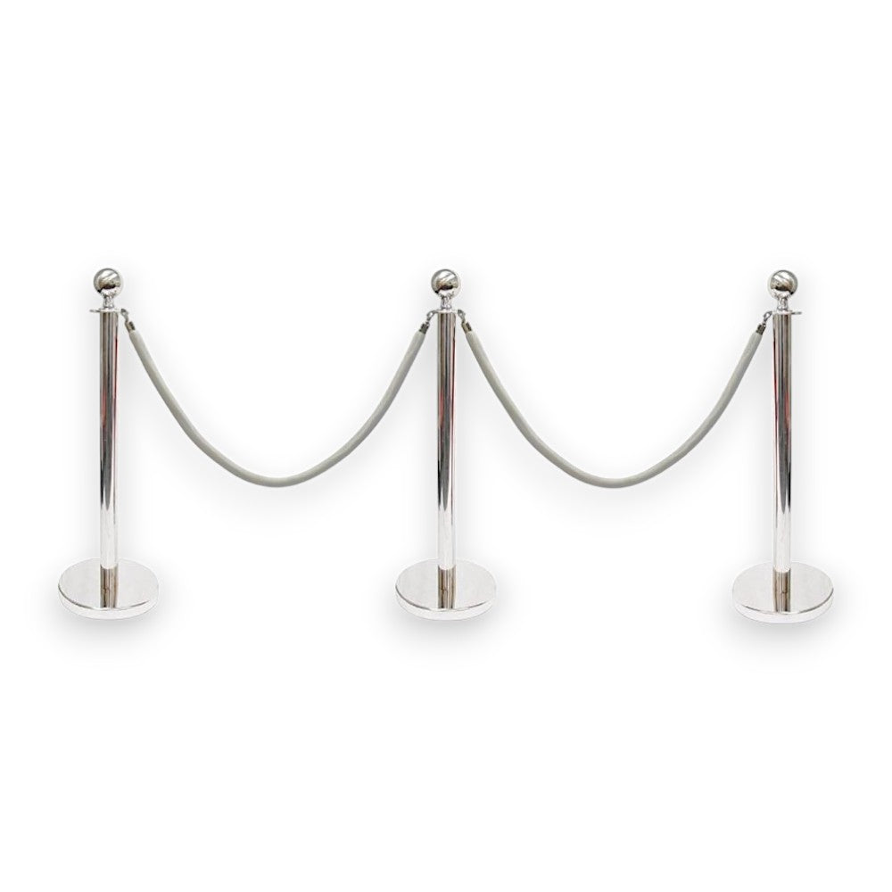 - Complete Set: 3 Silver bollard posts and 2 White velvet ropes.