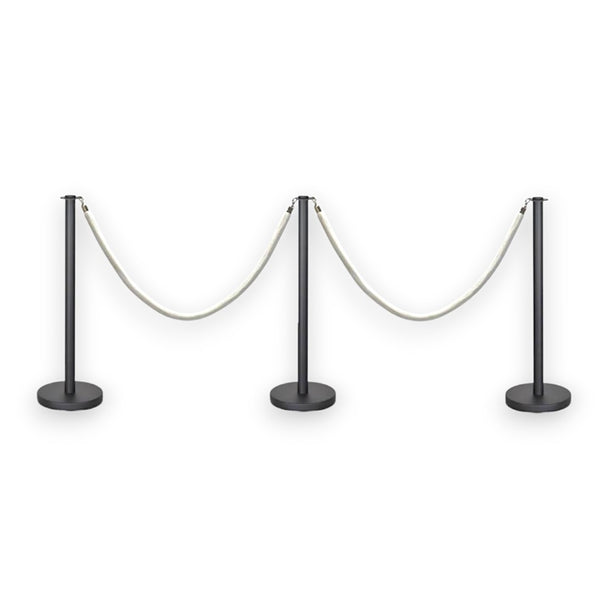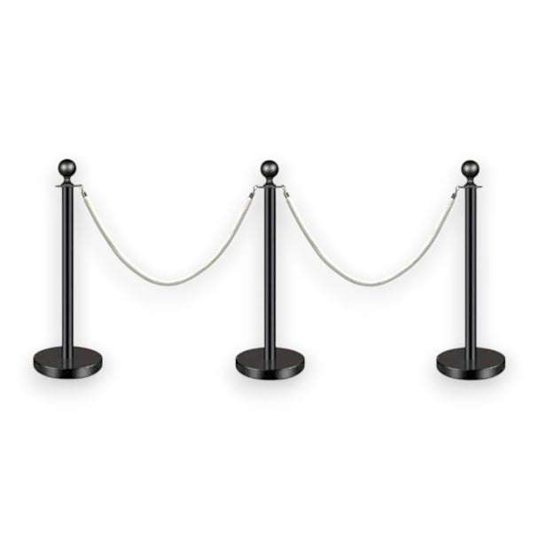 Black Crowd Control Bollards Set of 3 Posts + 2 White Ropes