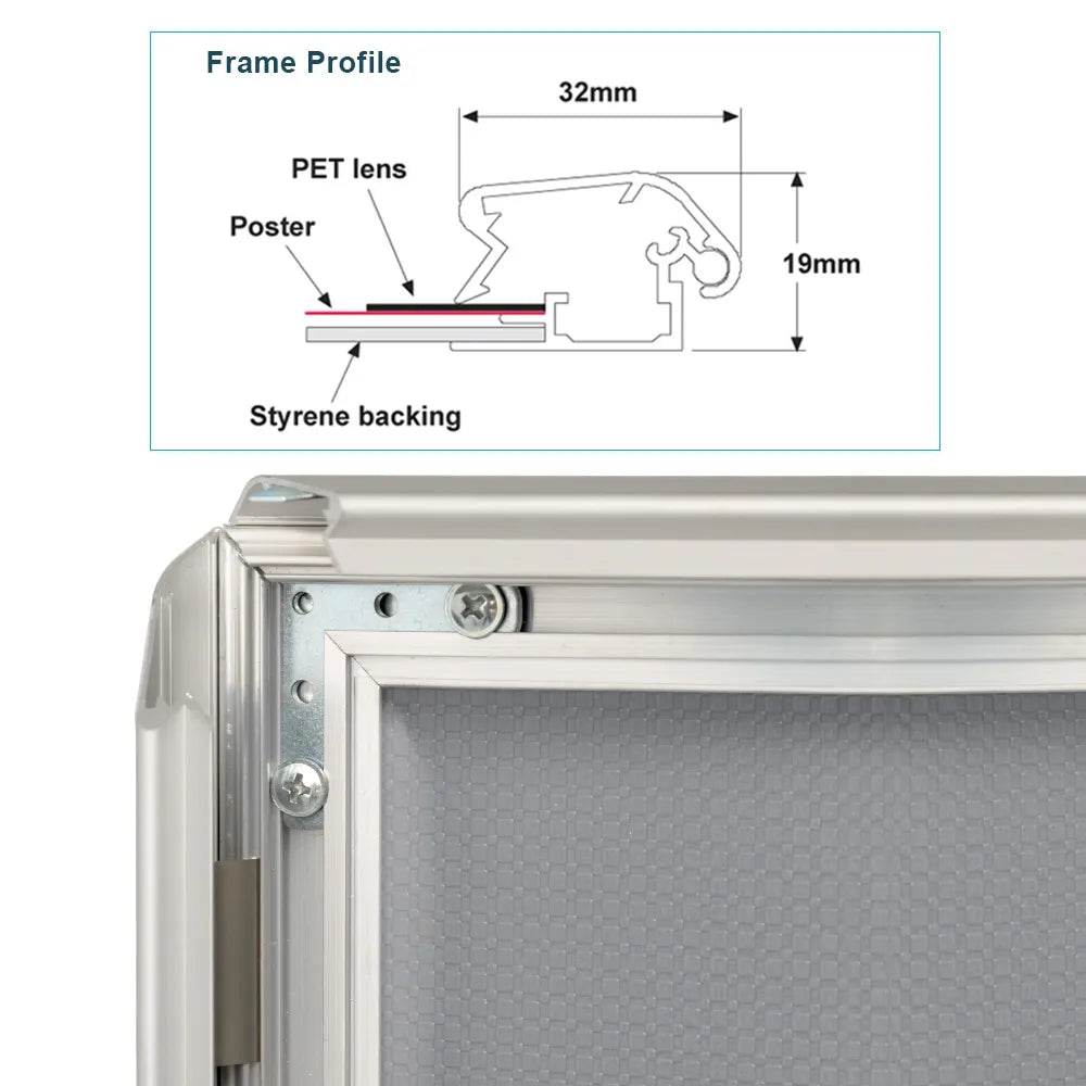 Our range of Snap Frames is designed for ease of use, featuring a user-friendly snap mechanism that allows for quick and effortless updates of messages or displays. These frames are crafted with a ANTI-GLARE cover sheet, enhancing the visibility of your content while reducing reflections. Each frame is easy to install, coming with its own set of wall-mounting screws for a secure fit. Made from robust silver aluminium and finished in matte, these frames offer both durability and a stylish look. They are ideal for a variety of users, from retail stores to real estate offices, and are available in multiple sizes to suit different needs. The inclusion of a non-reflective lens protects your displays while minimizing light disturbances. This makes them a perfect choice for those who need a fast and effective method to update their promotional or informational displays.
