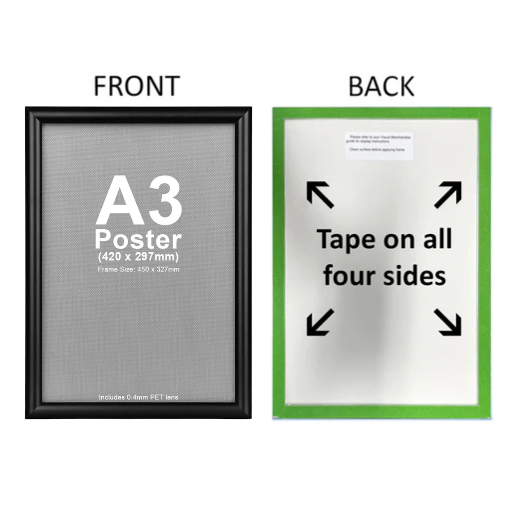 The front cover is a non-reflective PVC sheet for poster protection and visibility. This frame is designed to fit A3 size inserts and offers dual installation options: peel-and-stick adhesive backing or screw fixing.