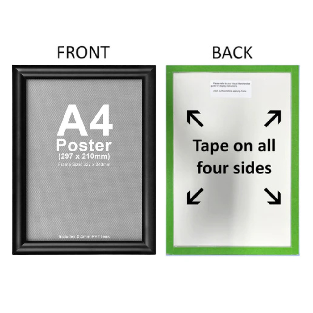 The front cover is a non-reflective PVC sheet for poster protection and visibility. This frame is designed to fit A4 size inserts and offers dual installation options: peel-and-stick adhesive backing or screw fixing.