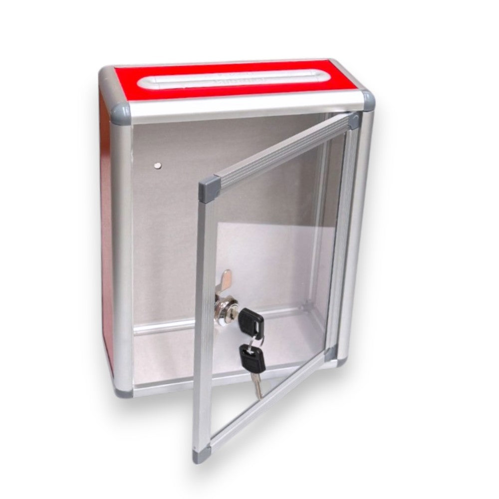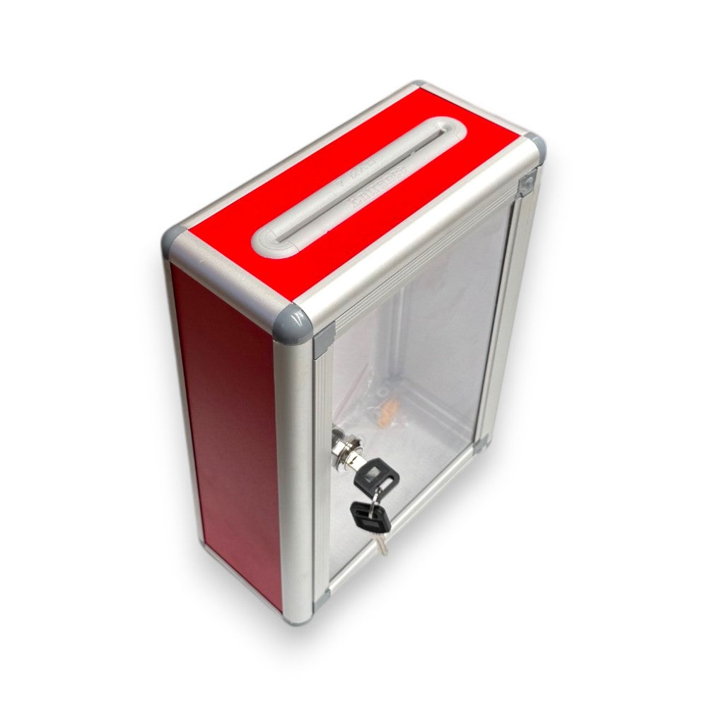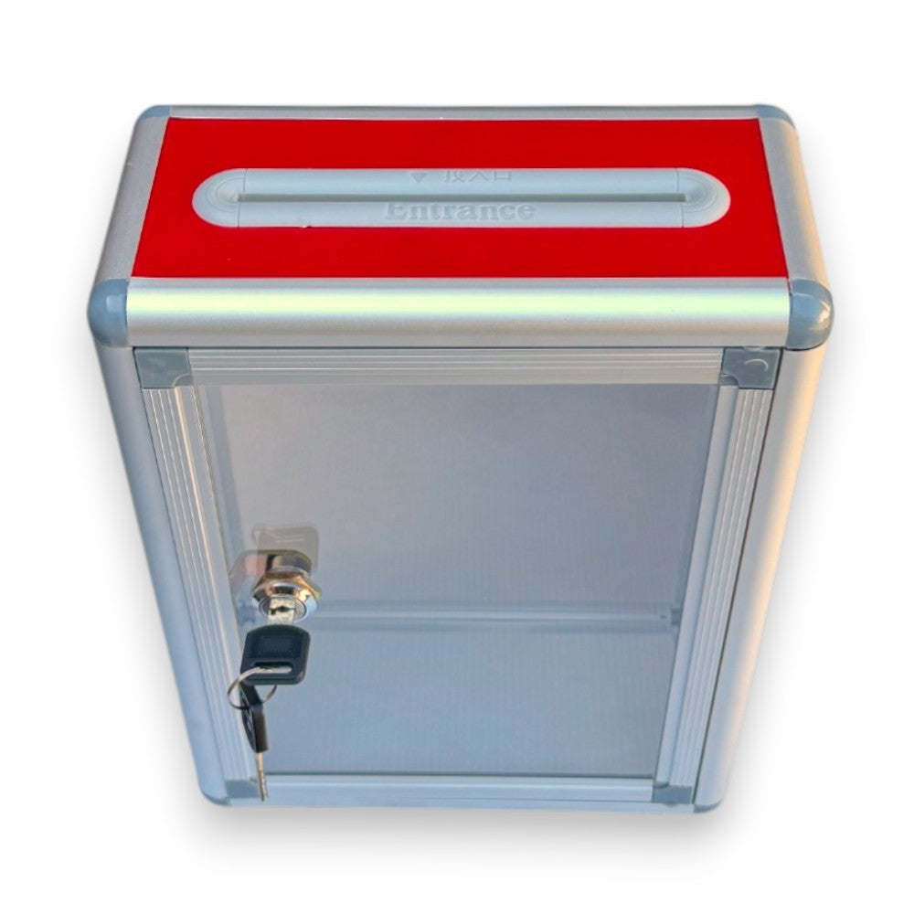 This Lockable Suggestion Box combines a sleek aluminum frame with a bold red panel, creating a modern and professional look that stands out in any setting. Designed for collecting feedback, suggestions, votes, or donations, it features a secure locking mechanism to ensure privacy and protection. With dual mounting options—countertop or wall mount—it offers flexibility to fit various environments. Its vibrant red panel enhances visibility, making it ideal for offices, schools, community centers, and public spaces. Durable, functional, and stylish, this suggestion box is the perfect solution for fostering engagement and communication.